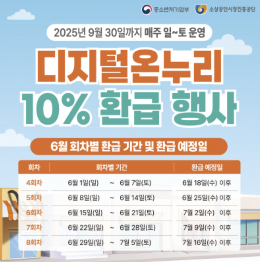예를 들어 한 주 동안 전통시장에서 디지털온누리상품권으로 20만 원 결제하면 10% 환급 = 2만 원(최대 한도) 환급을 받을 수 있습니다. 4개월이면 최대 수십만 원까지도 절약 가능하니 전통시장 자주 이용하는 분이라면 반드시 활용해야 할 혜택입니다.