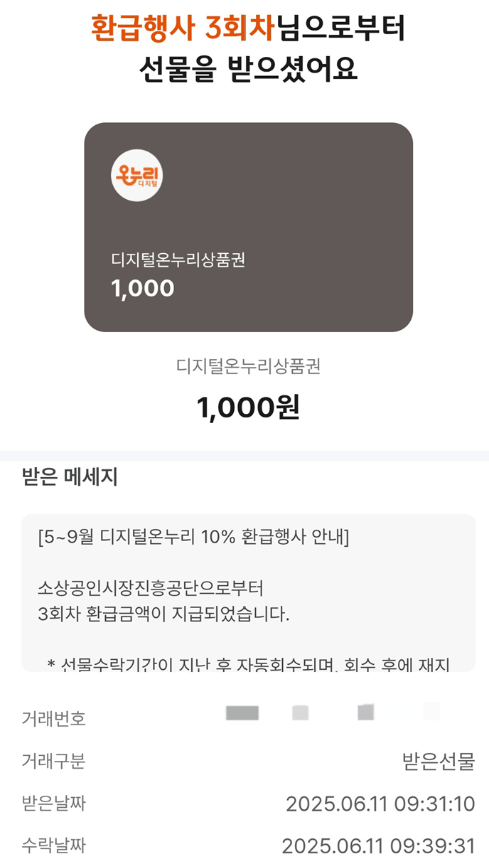 환급금은 회차별 결제 집계가 끝난 후 약 1주일 뒤부터 지급됩니다. 디지털온누리 앱 알림을 통해 '선물함'에 환급금이 들어왔다는 메시지를 받을 수 있고, 선물함에서 30일 이내에 등록해 수령해야 합니다.