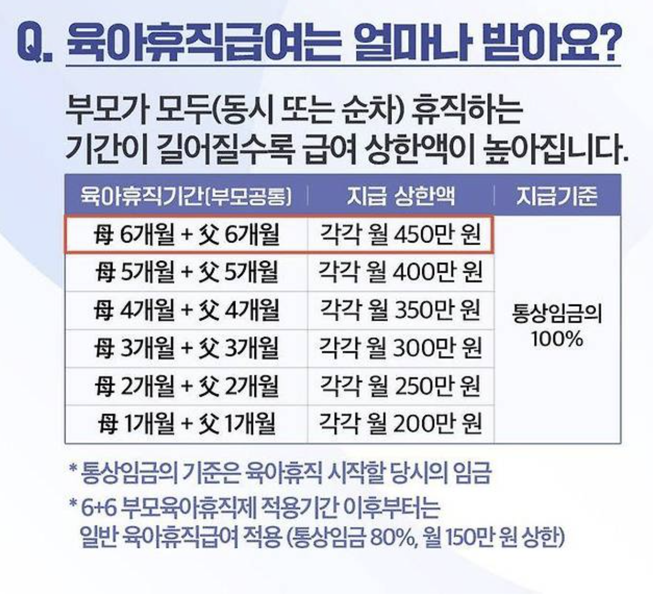 경제적으로 얼마나 이득일까요? 첫 3개월 동안은 최대 월 300만 원까지 받을 수 있으며, 이후 4개월 차부터는 기존 육아휴직 급여 기준에 따라 급여가 조정됩니다. 이처럼 단순한 제도 같지만 알고 신청하면 수백만 원의 차이를 만들 수 있는 6+6 육아휴직제는 특히 맞벌이 부부라면 꼭 활용해야 할 제도입니다.
