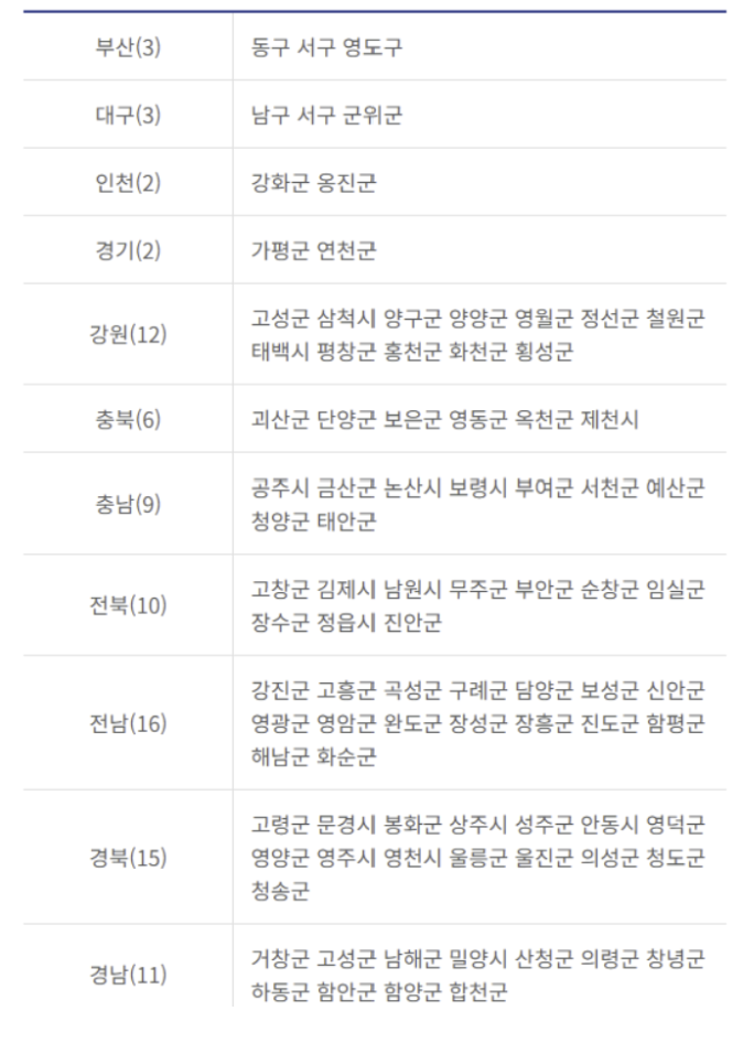 정부가 지정한 인구소멸지역은 총 89곳으로, 아래 표를 통해 쉽게 확인할 수 있습니다. 주민등록상 주소지가 아래 지역에 있으면 자동으로 추가 2만원이 지급됩니다.