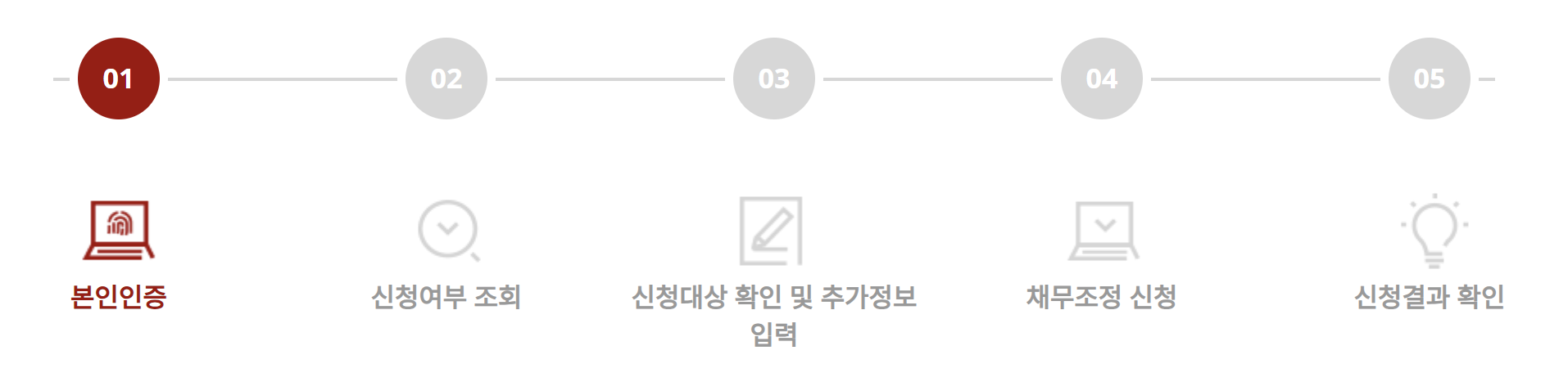 신청 절차는 본인 인증 → 자가진단 → 서류 제출 → 상담 접수 → 채무조정 방안 안내 순으로 진행되며, 특히 채무 조정 약정을 체결하기 전에 전문가의 상담을 받는 것이 필수적입니다.