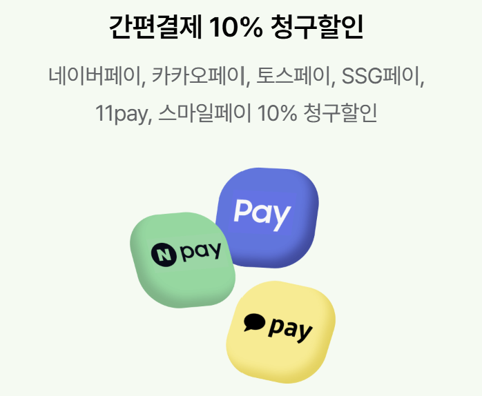 | 간편결제 10% 할인 | 네이버페이, 카카오페이, 토스페이 등 1만 원 이상 결제 시 10% 청구 할인 | 생활 밀착형 할인 |