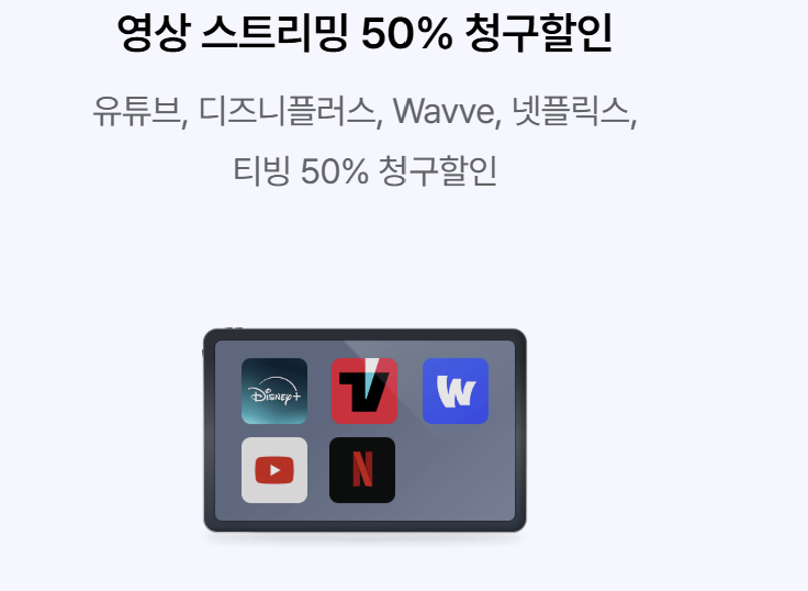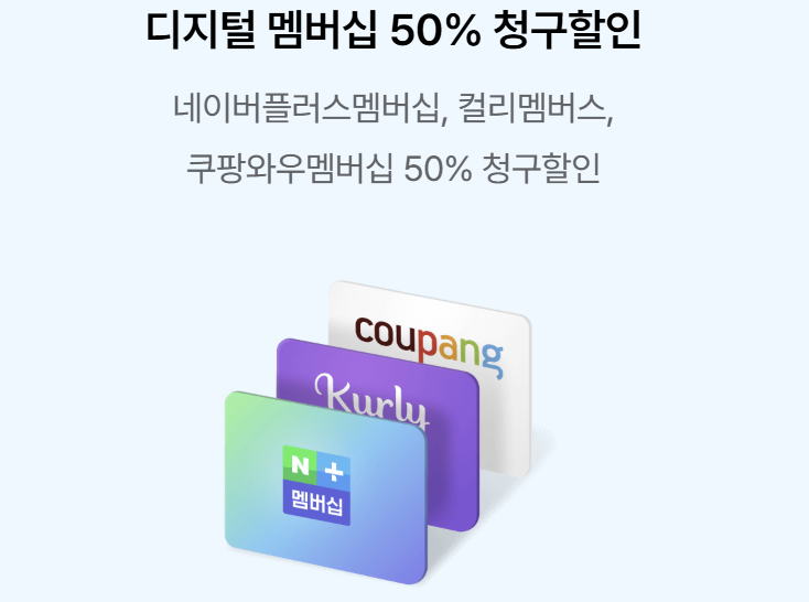 | OTT 구독 할인 | 유튜브프리미엄, 넷플릭스, 디즈니플러스 등 50% 청구 할인 | 정기결제 건에 한함 |