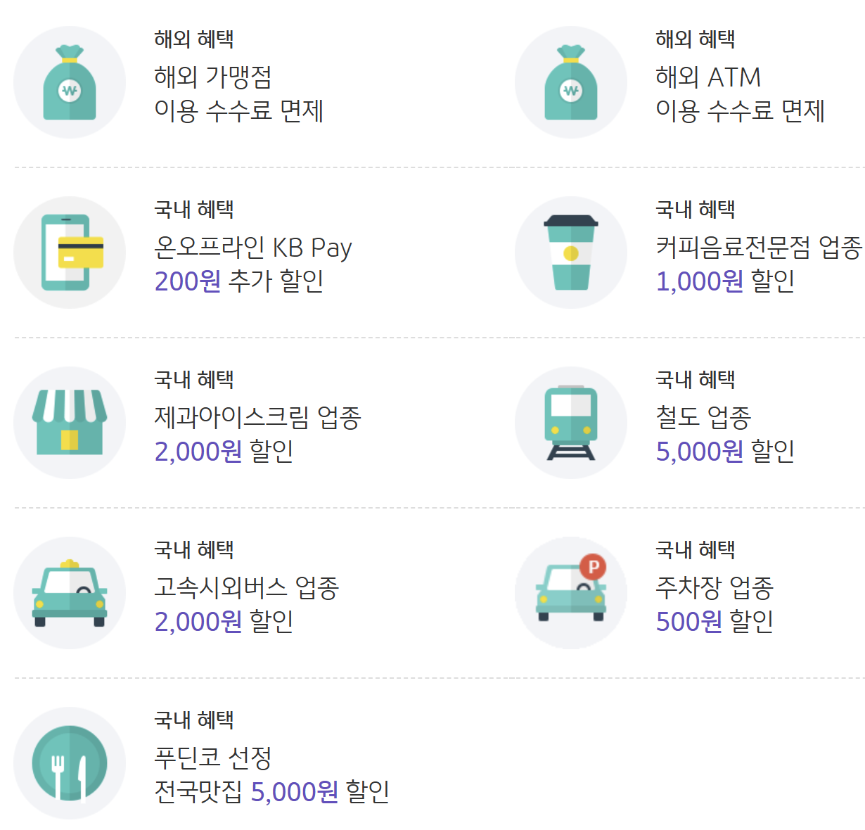 기타: 편의점 5% 할인, 대중교통 1% 할인
